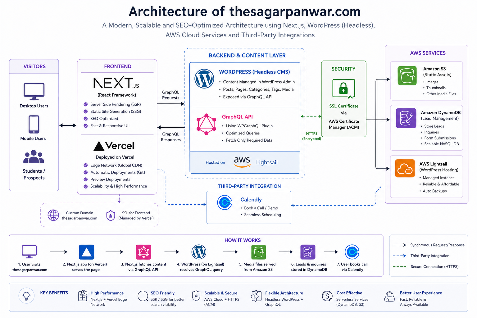 Learn how a real-world website is built using Next.js, AWS, DynamoDB, WordPress (headless), and GraphQL. Full system architecture explained.